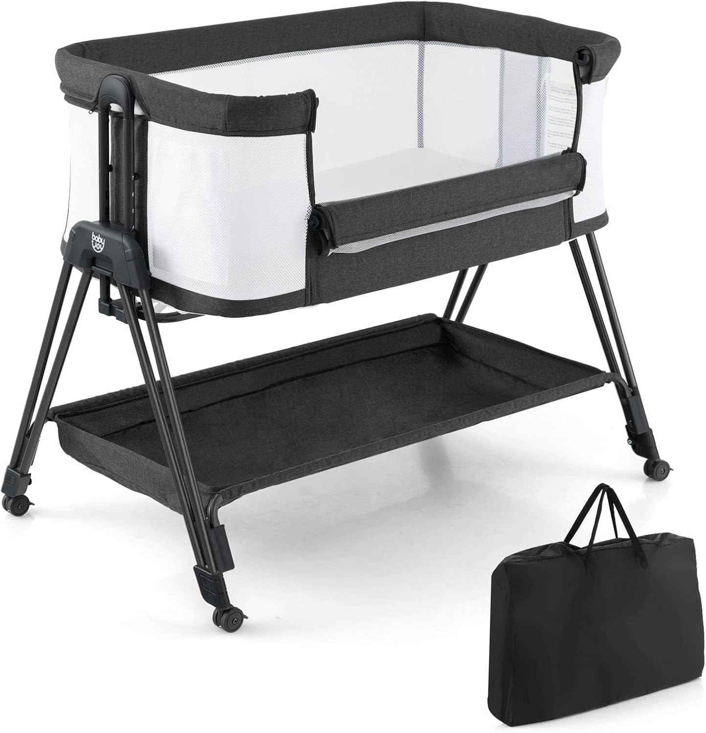 Functions as crib, bassinet, changer, playpen, and storage.Quick folding system with travel bag.