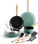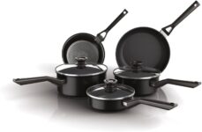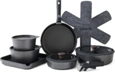 The 11-piece set includes two frying pans, two saucepans with lids, a stock pot with lid, and three kitchen utensils, offering versatile options for everyday cooking.