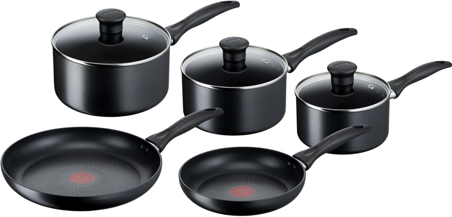 This 5-piece Salter Timeless pan set includes 16 cm, 18 cm, and 20 cm saucepans, a 14 cm milk pan, and a 24 cm non-stick frying pan, ideal for a wide range of cooking tasks.
