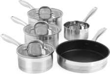 The saucepans come with tempered glass lids featuring steam vents, allowing for better nutrient retention and clear visibility while cooking.