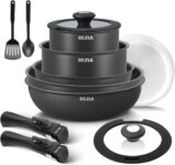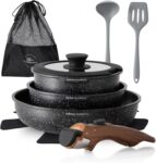 The 10-piece set includes two frying pans, one saucepan with lid, a detachable handle, two silicone utensils, two pot protectors, and a mesh storage bag.